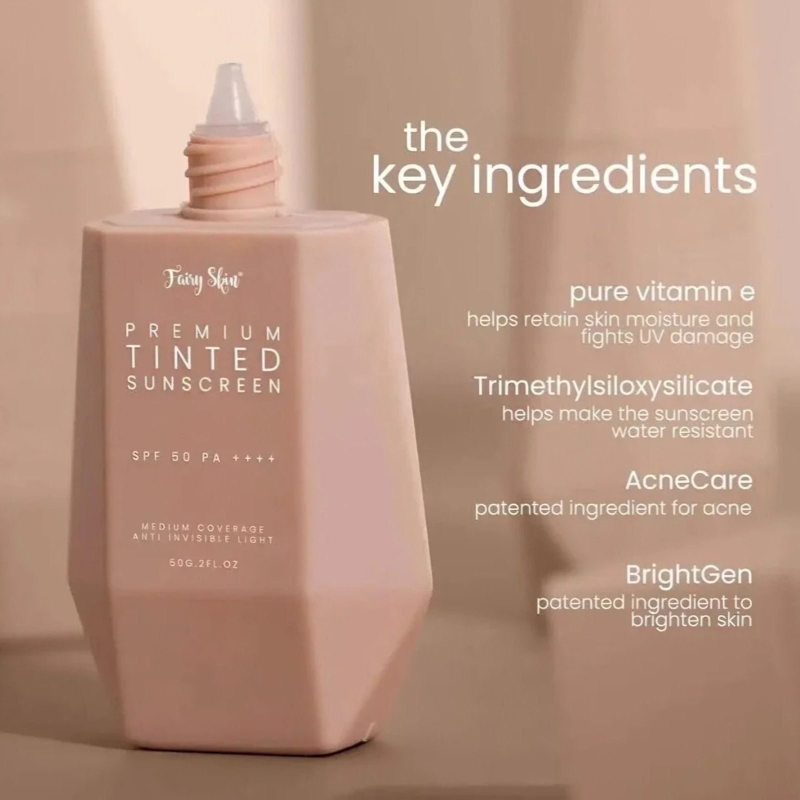Fairy Skin Premium Tinted Sunscreen provides SPF 50 + tint + skincare benefitsβa 3-in-1 routine that saves time and gives you a flawless finish.