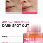 The Purito TXA 6 Niacinamide 10 Retinal Serum helps brighten skin, reduce dark spots, improve skin texture, and minimize fine lines by combining powerful ingredients like Tranexamic Acid, Niacinamide, and Retinal.